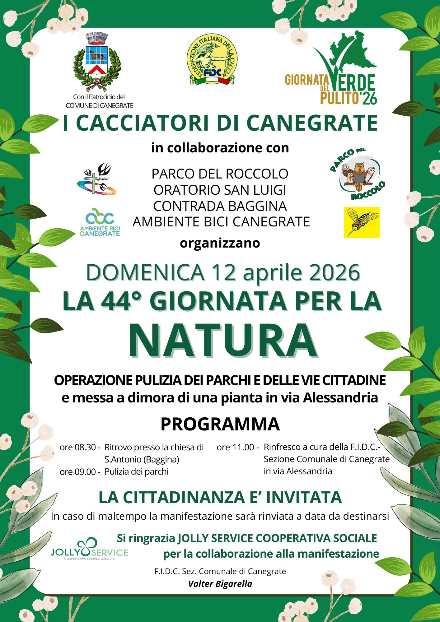 La Federazione Italiana della Caccia – sezione comunale Canegrate con il Patrocinio del Comune di Canegrate e in collaborazione con il Parco del Roccolo, l’Oratorio San Luigi, la contrada Baggina e Ambiente Bici Canegrate organizza per Domenica 12 APRILE 2026 la “44° Giornata per la Natura”.