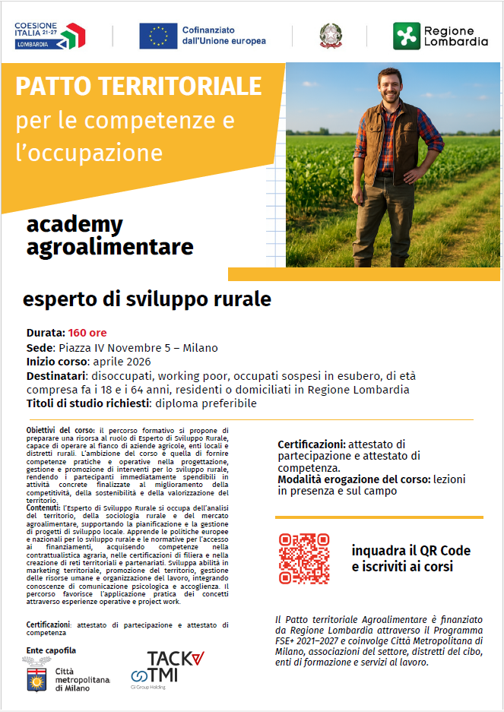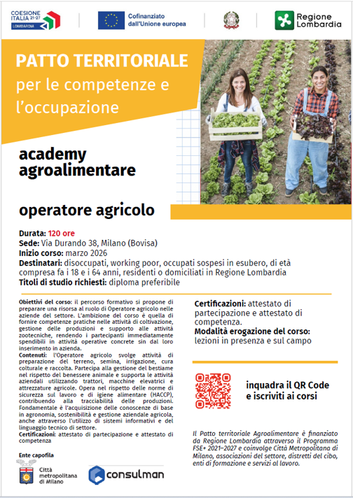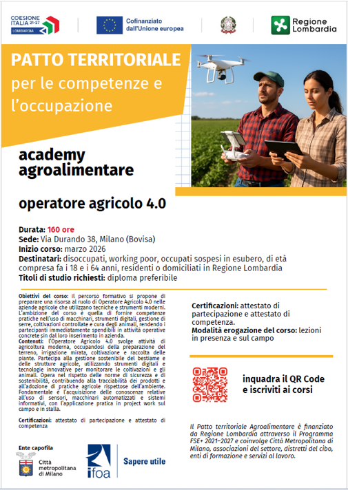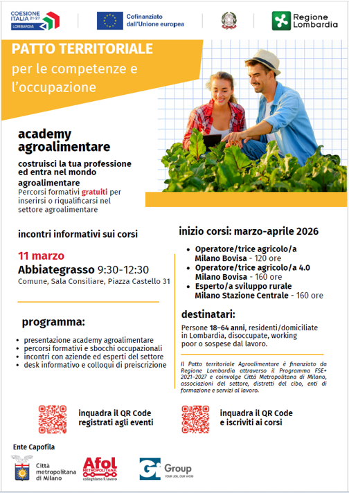 Prende avvio il Patto Territoriale per le Competenze e l’Occupazione nel settore Agroalimentare, promosso dalla Città Metropolitana di Milano e finanziato da Regione Lombardia, con l’obiettivo di rafforzare le competenze professionali e favorire nuove opportunità di occupazione nel settore agroalimentare.
