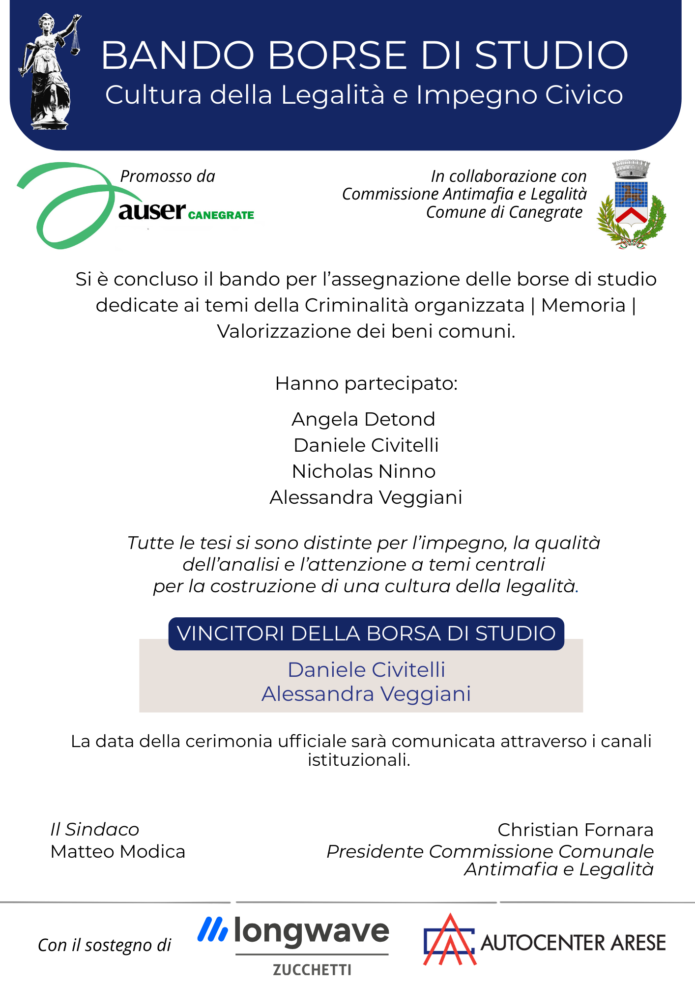 Si è concluso il bando per l’assegnazione delle borse di studio dedicate all’approfondimento dei temi della criminalità organizzata, della memoria e della valorizzazione dei beni comuni, promosso da Auser Canegrate in collaborazione con la Commissione Antimafia e Legalità del Comune di Canegrate.