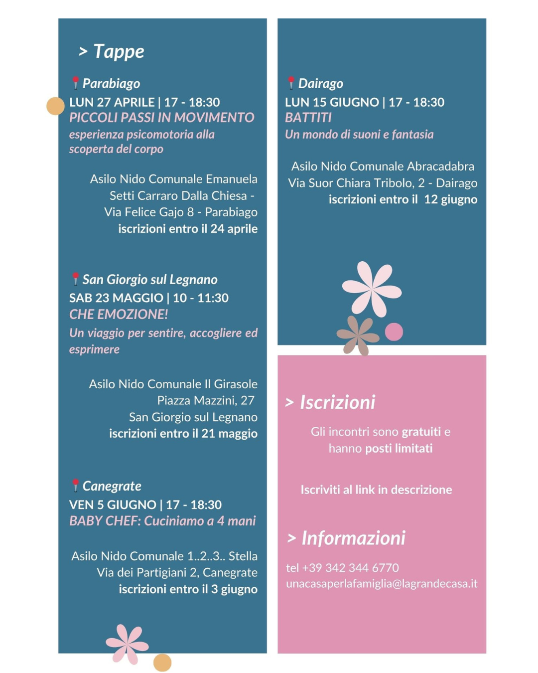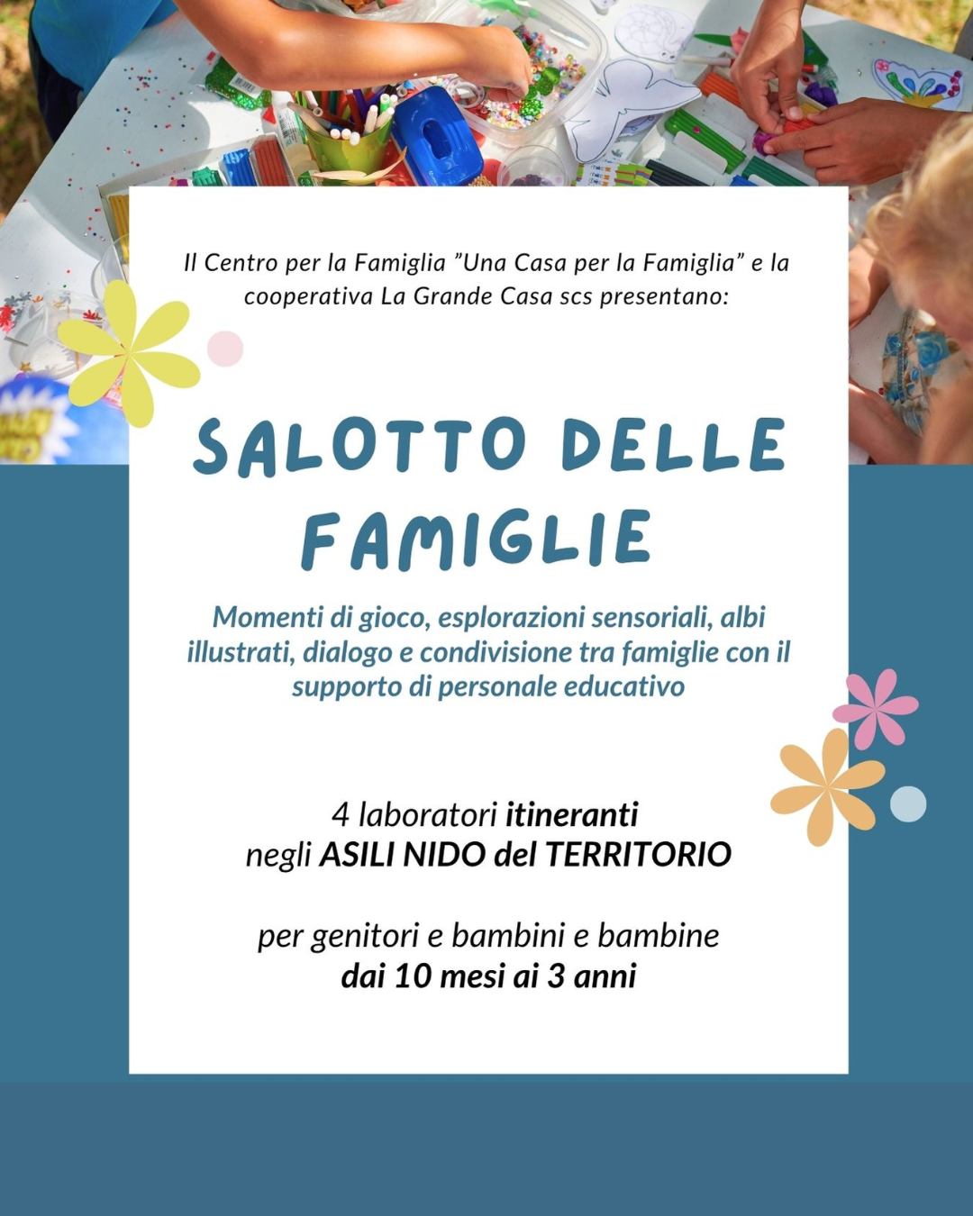 L’iniziativa, organizzata dal Centro per la Famiglia “Una Casa per la Famiglia” e La Grande Casa scs, propone laboratori esperienziali per genitori e bambini e bambine tra i 10 mesi e i 3 anni, in un contesto accogliente e guidato da educatori qualificati.