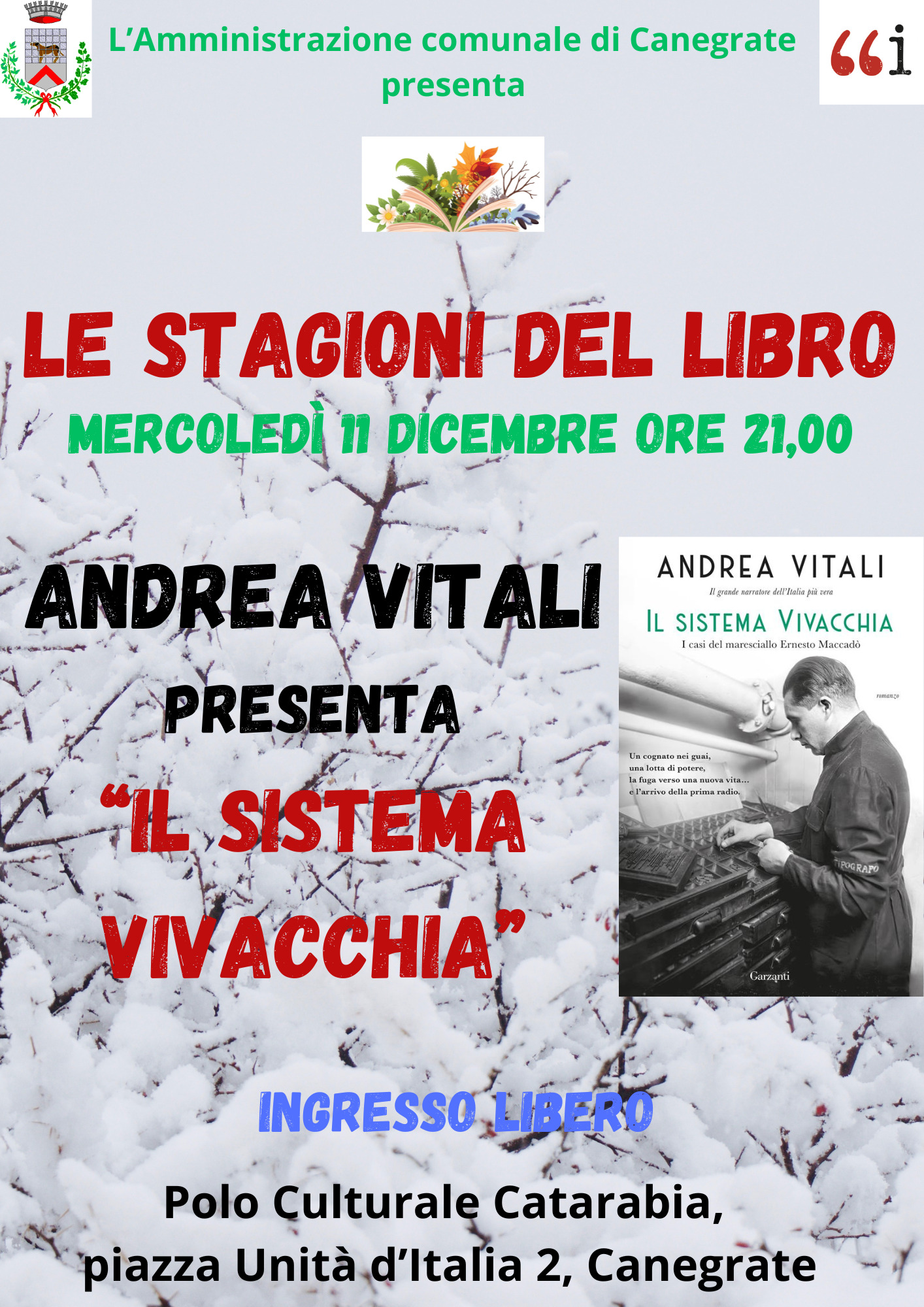 Giunti al quarto ed ultimo appuntamento della rassegna letteraria organizzata e patrocinata dal Comune di Canegrate LE STAGIONI DEL LIBRO, l’autore ANDREA VITALI presenta il suo libro “IL SISTEMA VIVACCHIA”: piacevole narrazione ambientata sul Lago Lario che vede un cognato nei guai, una lotta di potere, la fuga verso una nuova vita… e l’arrivo della prima radio.