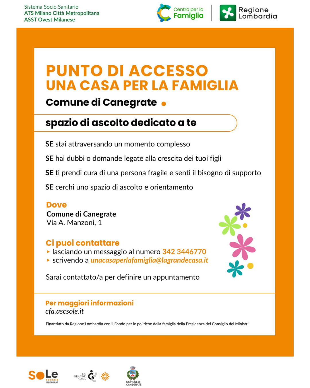 L’Amministrazione comunale informa la cittadinanza dell’attivazione del servizio “Punto di Accesso – Una Casa per la Famiglia”, uno spazio dedicato all’ascolto, all’orientamento e al supporto delle persone e delle famiglie.