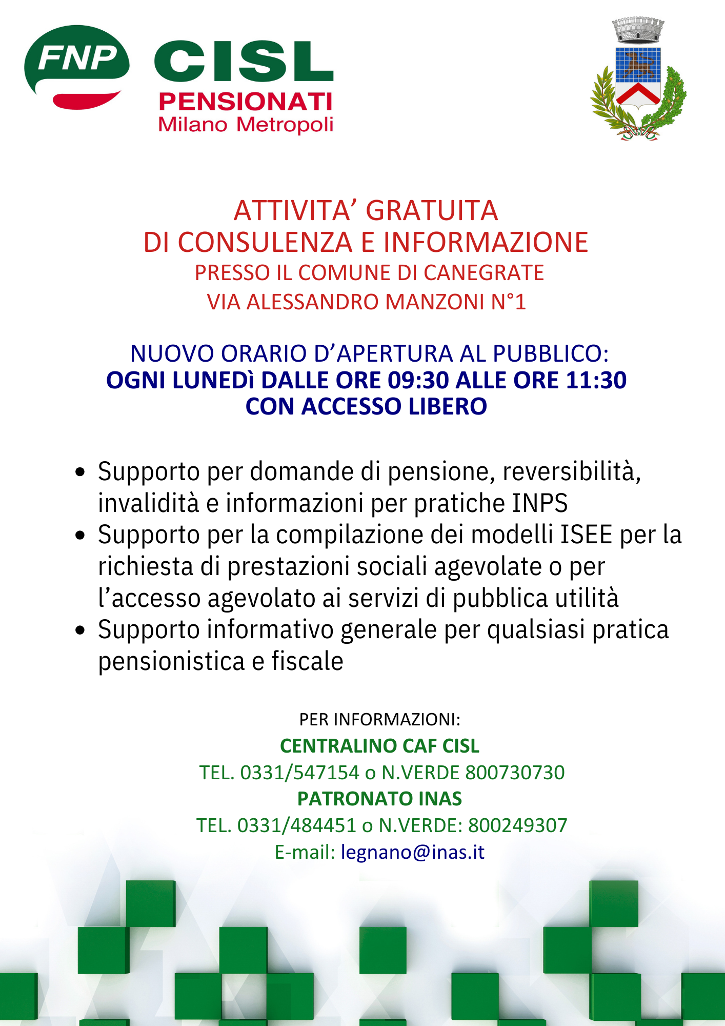 Lo sportello sarà ora attivo ogni lunedì mattina, dalle ore 9.30 alle ore 11.30, con accesso libero, al piano terra del Municipio in Via Manzoni 1. Il servizio è gestito dalla Federazione Nazionale Pensionati CISL, che mette a disposizione un agente sociale dedicato per fornire supporto e orientamento ai cittadini.