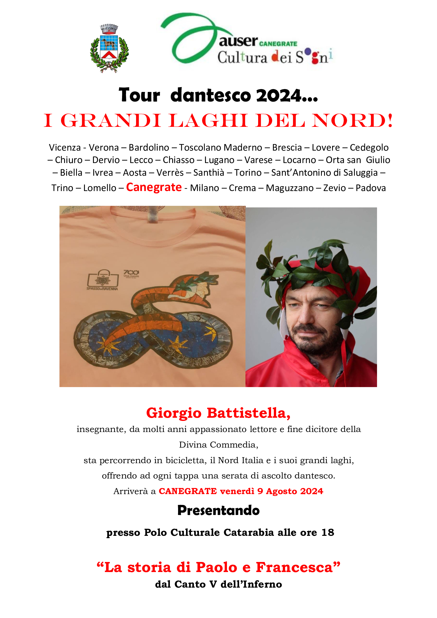 L’Amministrazione Comunale e l’Associazione Auser Cultura dei Sogni, sono orgogliose di ospitare Venerdì 9 agosto alle ore 18:00 al Polo Culturale Catarabia, la tappa canegratese del “Tour Dantesco 2024” ideato e realizzato dal Professor Giorgio Battistella: insegnante, appassionato lettore e fine dicitore dell’opera più conosciuta di Dante Alighieri.