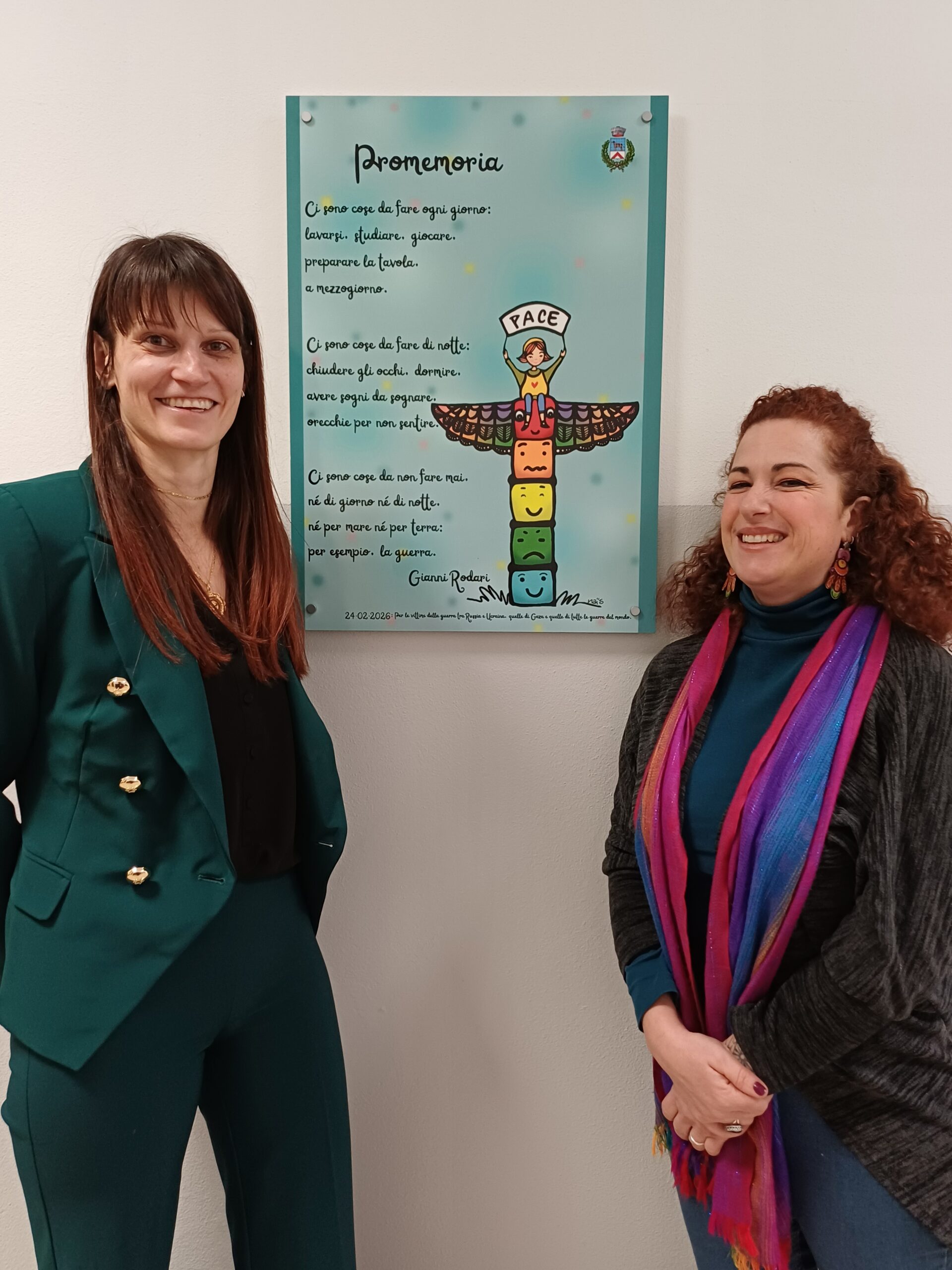 All’interno del Palazzo Municipale, accanto all’Ufficio Cultura, Educativi e Sport, è stato collocato un pannello con la poesia “Promemoria” di Gianni Rodari, autore che con parole semplici e profonde ha saputo parlare a generazioni diverse, invitando alla riflessione sui temi della guerra e della responsabilità collettiva.