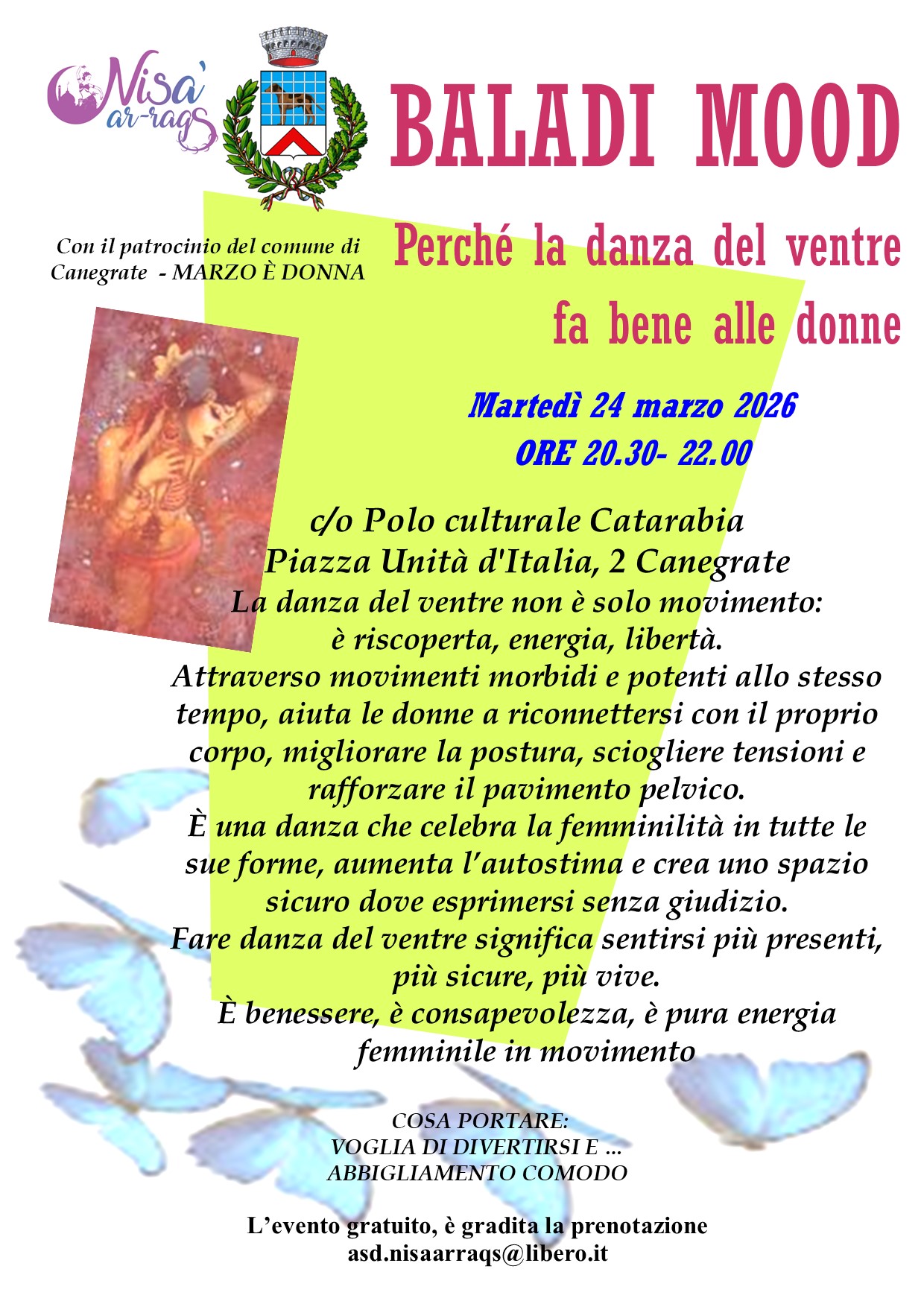 A cura di NISA’ AR-RAQS Le donne della danza, martedì 24 alle h. 20,30 presso Polo Catarabia, evento “Baladi Mood. Perché la danza del ventre fa bene alle donne”