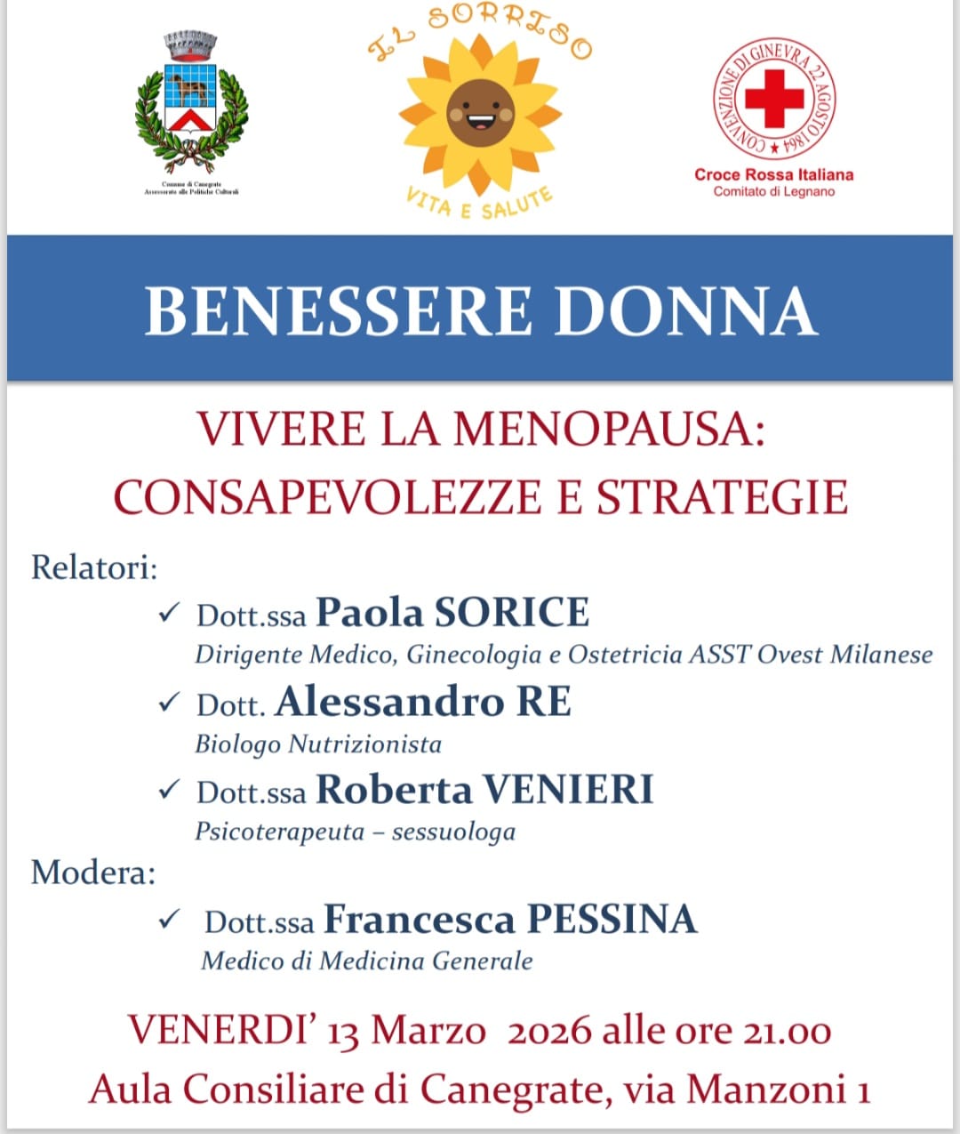A cura de II Sorriso Vita e Salute, venerdì 13 marzo alle h. 21 presso Aula Consiliare, via Manzoni 1 – Canegrate, evento Benessere donna. Vivere la menopausa: consapevolezza e strategie