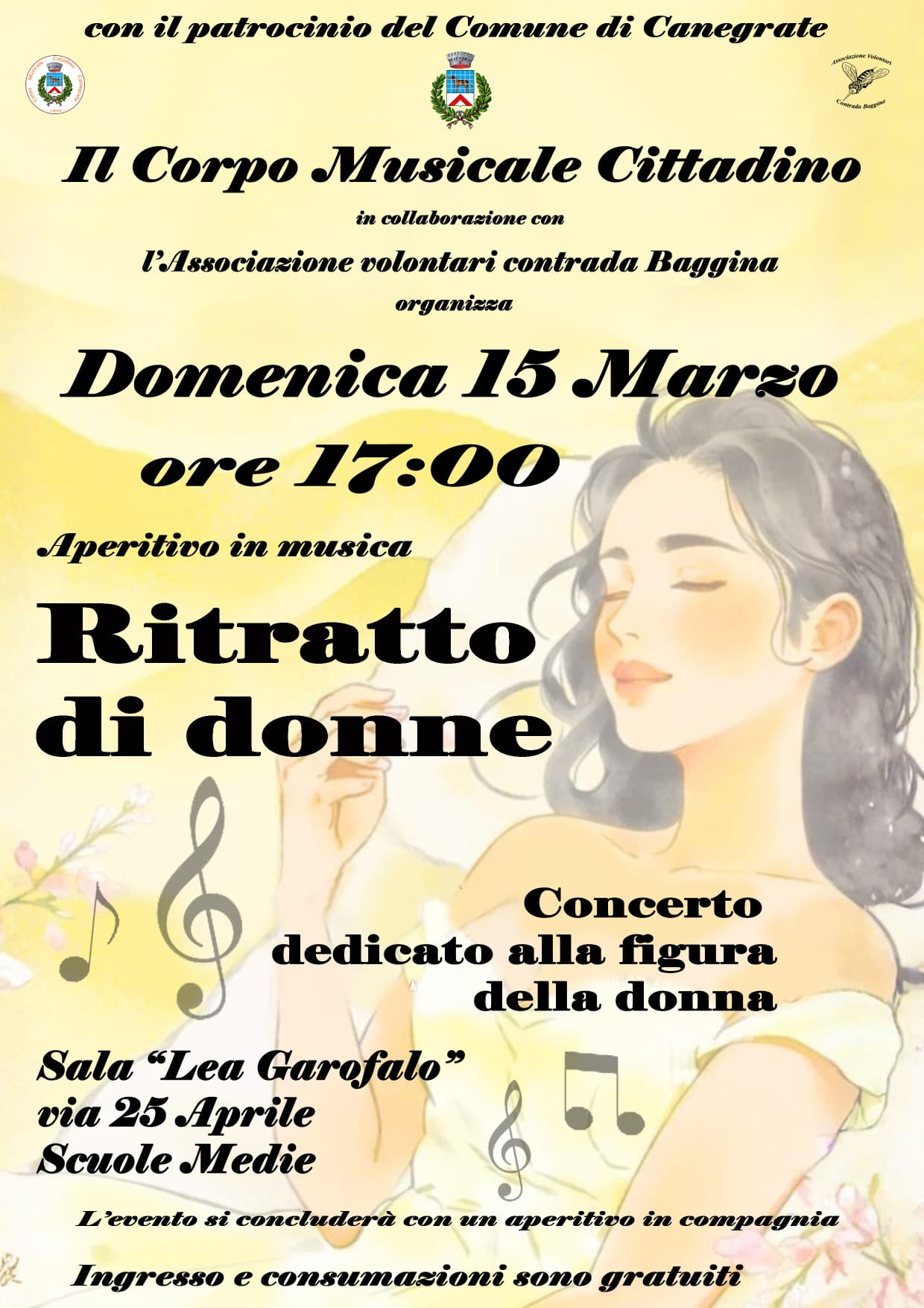 A cura del Corpo Musicale Cittadino, domenica 15 marzo alle h. 17, concerto “Ritratto di donne” presso la Sala Lea Garofalo del Comune