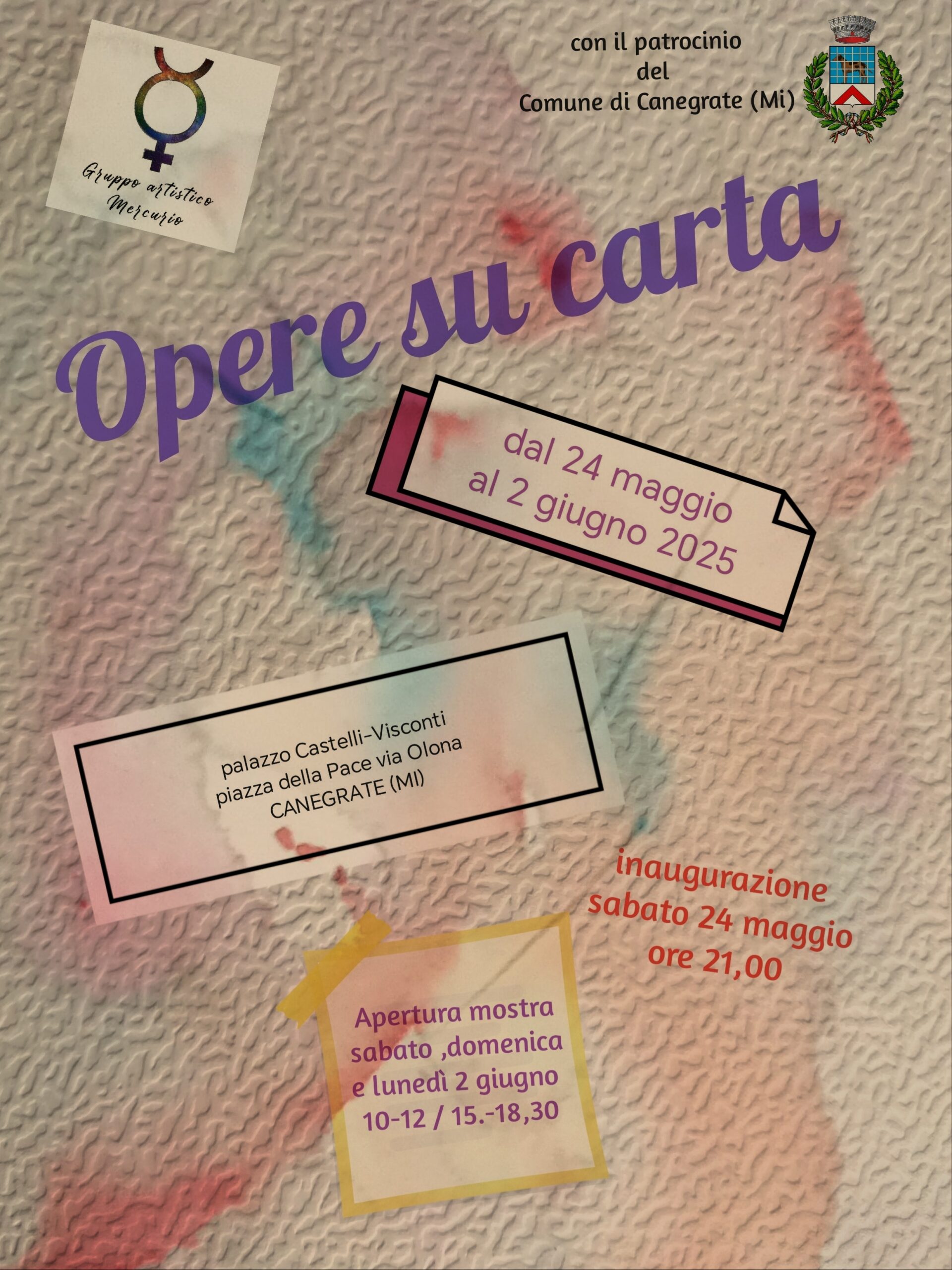 La Mostra patrocinata dal Comune di Canegrate, sarà inaugurata nelle sale di Palazzo Visconti-Castelli Sabato 24 Maggio e resterà aperta al pubblico fino a Lunedì 2 Giugno.